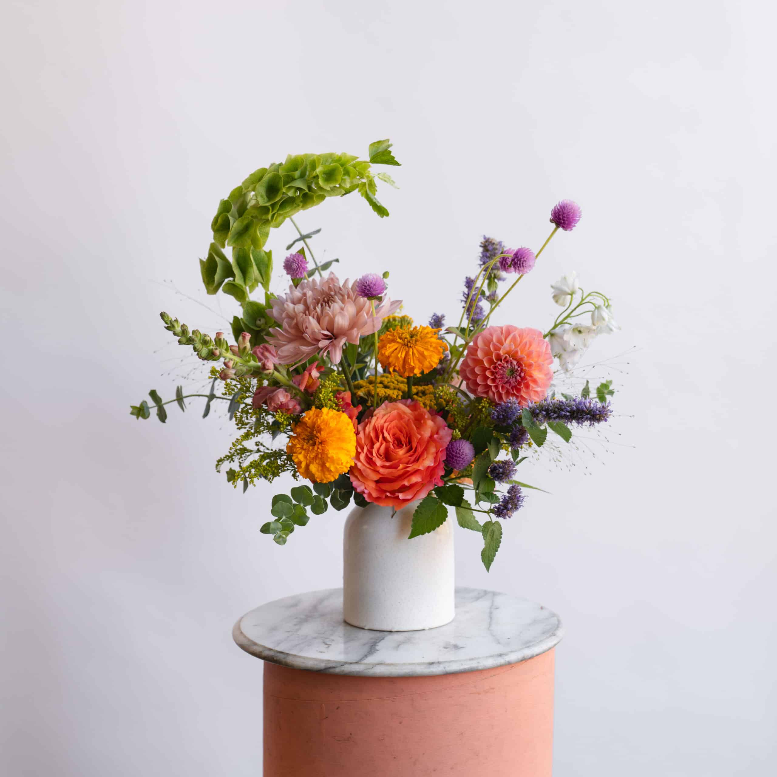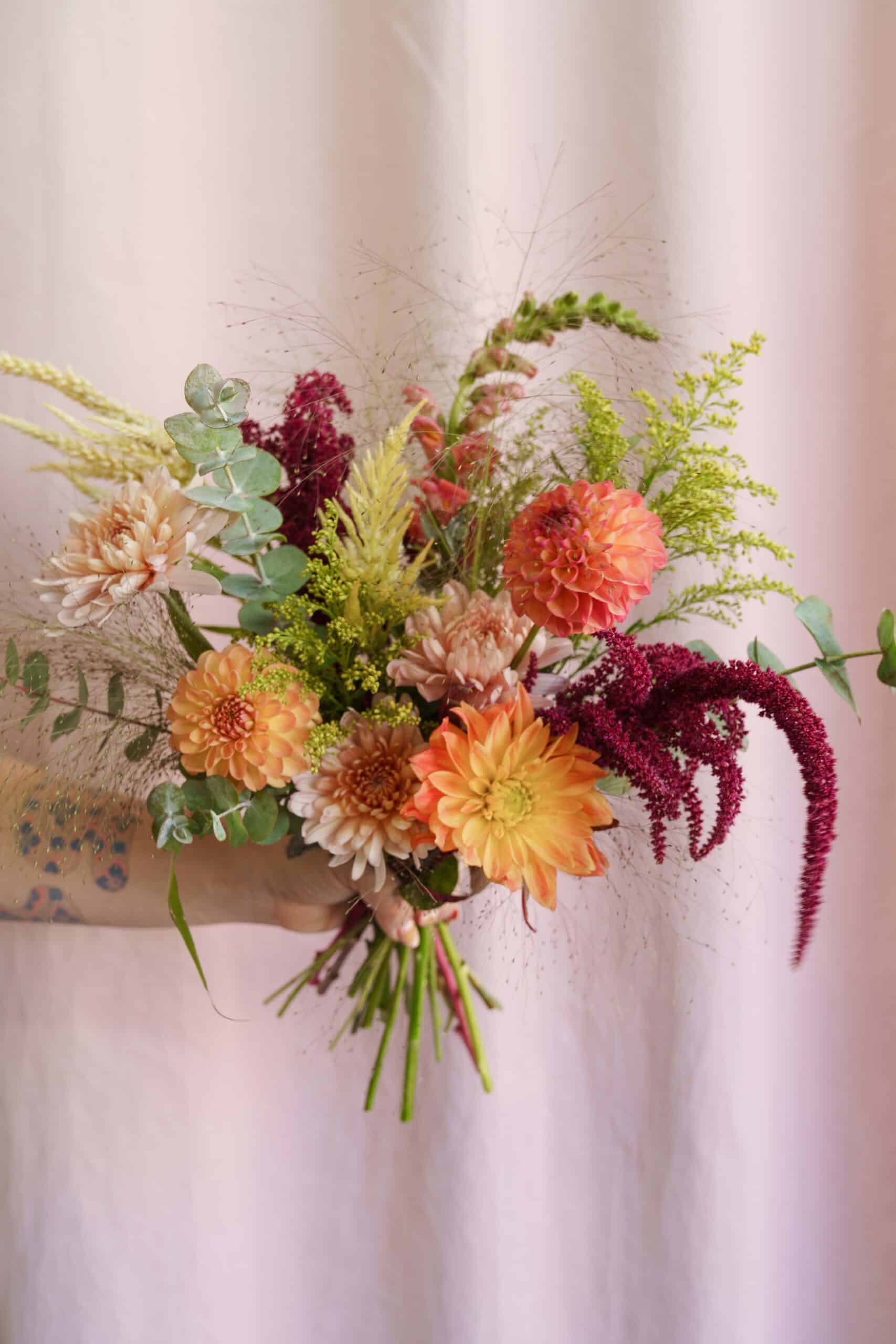 This bespoke bouquet features a curated collection of dahlias, mums, solidago, amaranth, eucalyptus, and snapdragons, all chosen for their rich, warm fall palette. Each flower is hand-selected to bring a vibrant autumnal atmosphere to any space. As with all our floral arrangements, this bouquet is artistically designed by our team at Stems Brooklyn and made to order, ensuring you receive a fresh and intentional design.